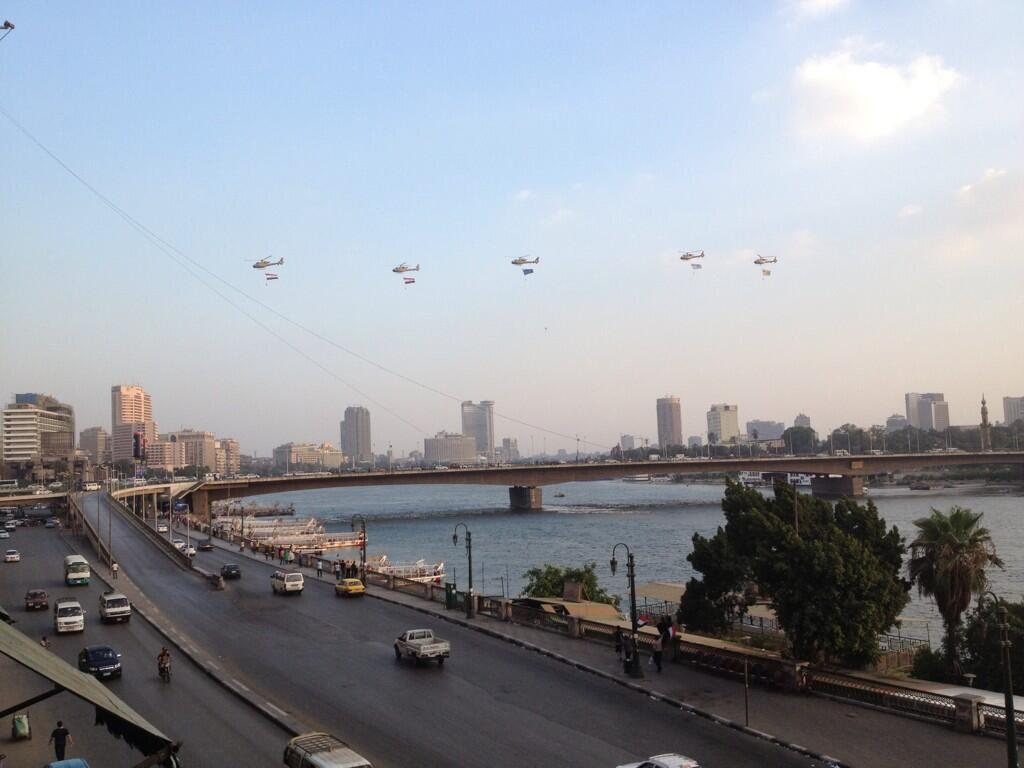 Une diffusion qui fut aussitôt suivie du survol du Caire par 5 hélicoptères léger d'attaque et de reconnaissance Gazelle (appareils produits sous licence à partir de 1978 par l'Arab British Helicopter Company, joint-venture anglo-italo égyptienne) tractant d'immenses drapeaux égyptiens (pour au moins 3 d'entre eux - cf. la vidéo).